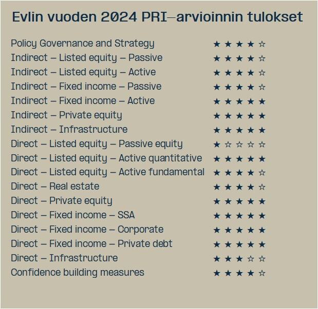”Vastuullisuus on jo pitkään integroitu osaksi koko sijoitustoimintaamme ja olemme Evlissä hyvin ilahtuneita nähdessämme, että systemaattisen työmme tulokset näkyvät myös vuoden 2024 PRI:n arviossa. Tulemme käymään tuloksia tarkasti ja laajamittaisesti läpi, jotta voimme jatkaa toimintatapojemme kehittämistä eri omaisuusluokissa”, kommentoi Evlin vastuullisen sijoittamisen seniorianalyytikko Elina Niiranen.