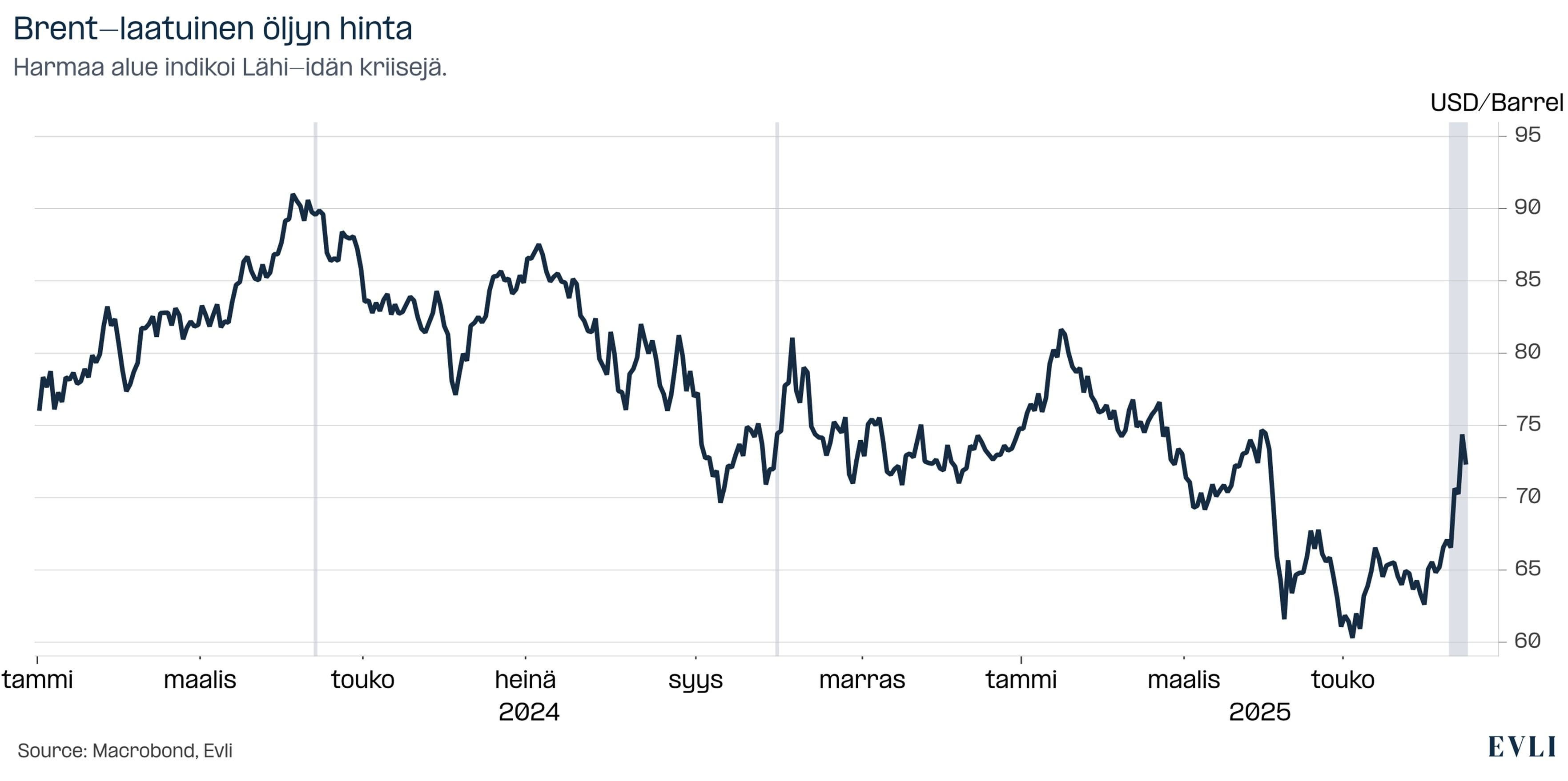 Kuvio 1: Öljyn hinta on reagoinut Israelin hyökkäykseen, mutta ei vielä merkittävästi