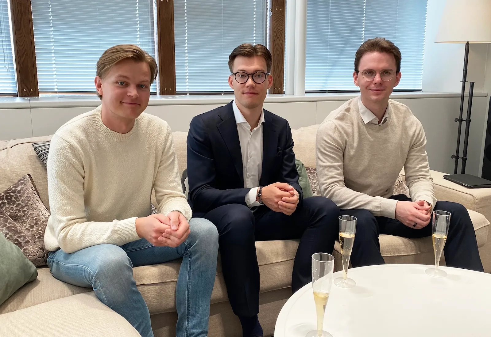 Harjoittelijoita juhlistamassa kevään Trainee-ohjelman päätöstä: Fredric Sigfrids, Caj Wärn ja Mikael Hörkkö.