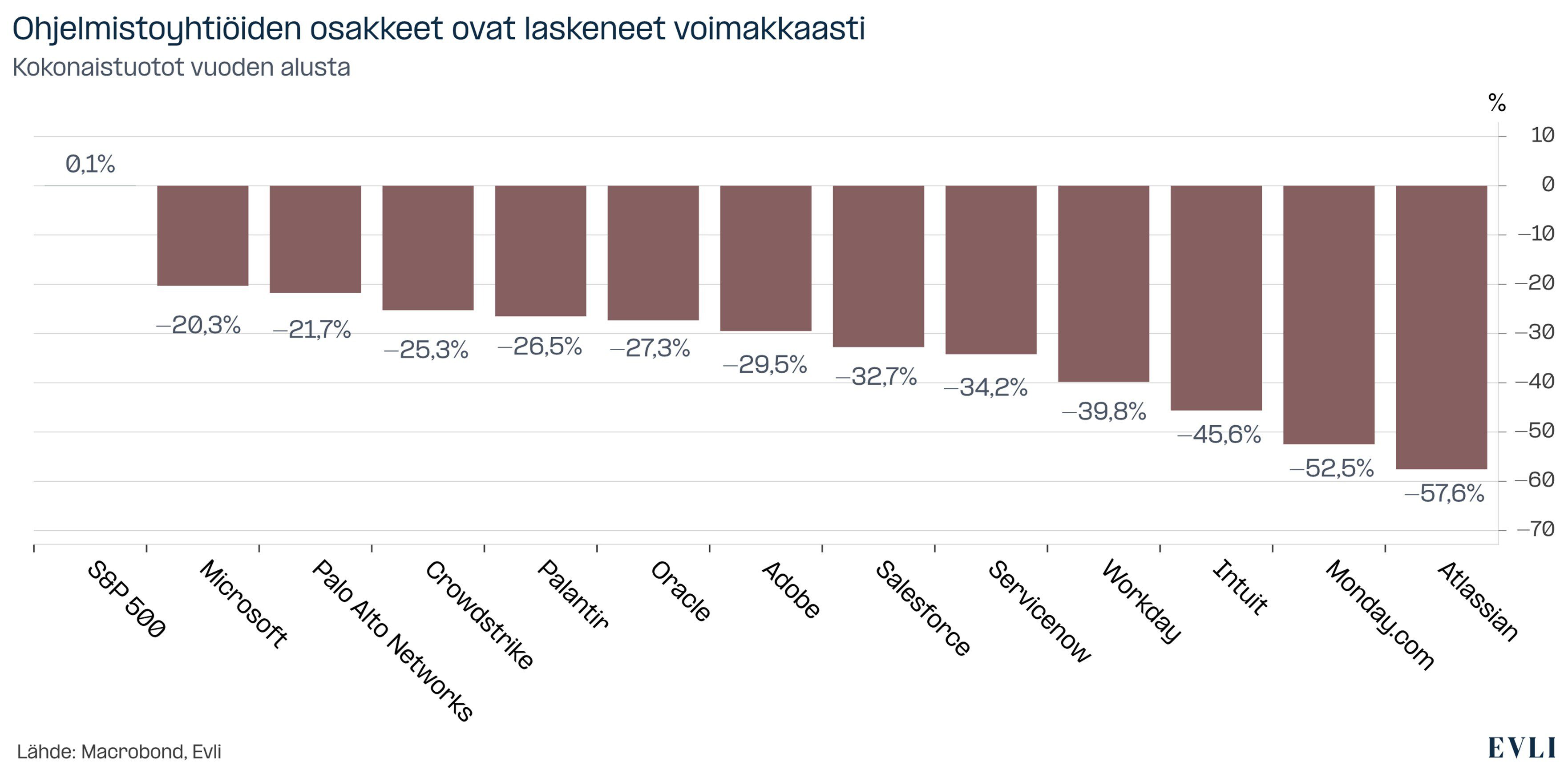 Kuvio 1: Ohjelmistoyhtiöiden pörssikurssit ovat laskeneet voimakkaasti vuoden alusta
