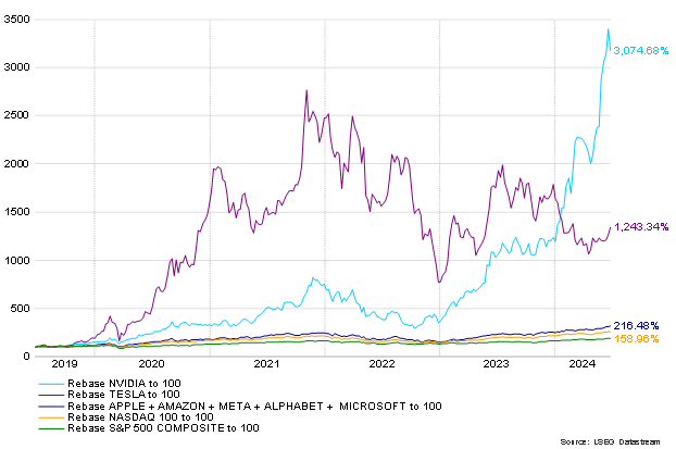 Kuva: Nvidian osakekurssin nousu on jättänyt taakseen muut Magnificent 7 -ryhmään kuuluvat osakkeet viidessä vuodessa