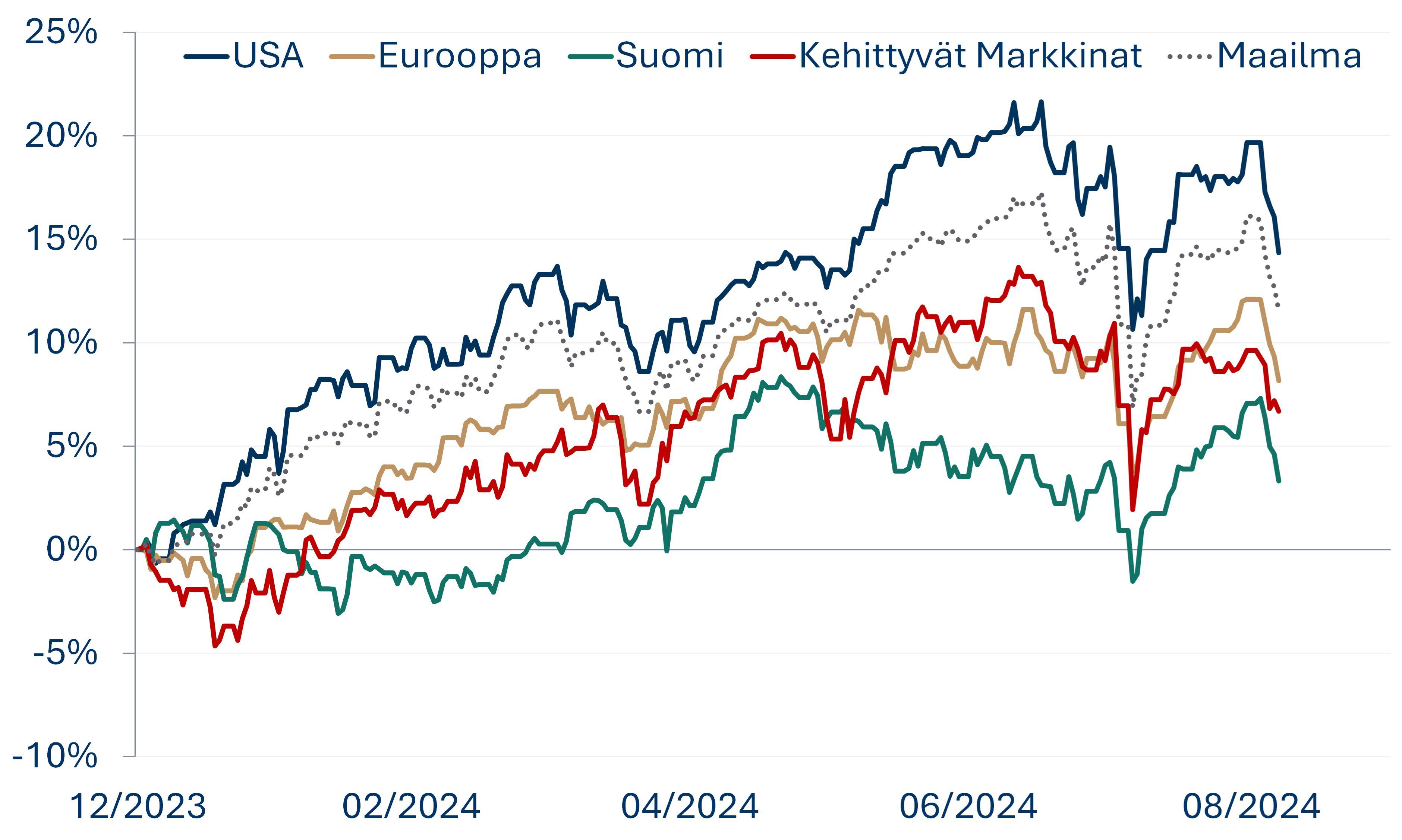 Globaalin talouden näkymät ovat kahtalaiset. Kasvu jatkuu Yhdysvalloissa, siinä missä Eurooppa ja Kiina vielä hakevat vauhtiaan. Yhdysvaltojen talous on suuntaamassa kohti niin sanottua pehmeää laskua, tilannetta jossa talous jäähtyy, mutta ei ajaudu taantumaan. Muutamista viime aikojen heikommista taloudellisista indikaattoreista huolimatta kotitalouksien vakaa taloudellinen tilanne, yritysten vahvat fundamentit ja keskuspankkien kevyempi rahapolitiikka tukevat tätä lopputulemaa. Lisäksi yritysten tulokset ovat Yhdysvalloissa parantuneet jatkuvasti, mikä edelleen vahvistaa positiivisia talousnäkymiä maassa.