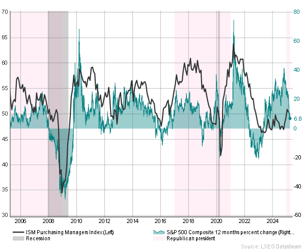 Kuva: USA:n osakemarkkinoiden nousu vuoden takaisesta on hidastunut 6,8 prosenttiin ja teollisuuden suhdanneodotukset ovat aavistuksen yli 50 pistettä