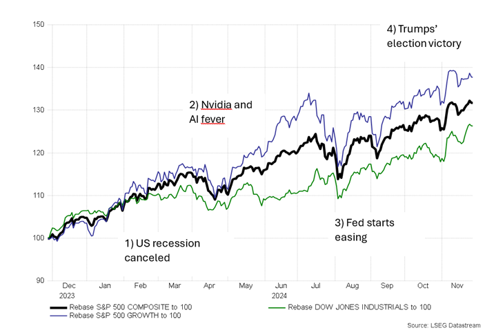 Trump’s economic policy is expected to maintain the federal budget deficit and continue the increase in national debt. However, the appointment of hedge fund manager Scott Bessent reassured markets, and the sharp rise in US long rates in October turned into a slight decline in November. The Fed is expected to cut rates again at its meeting in December, although several members of the Board of Governors have recently been more cautious in their views.