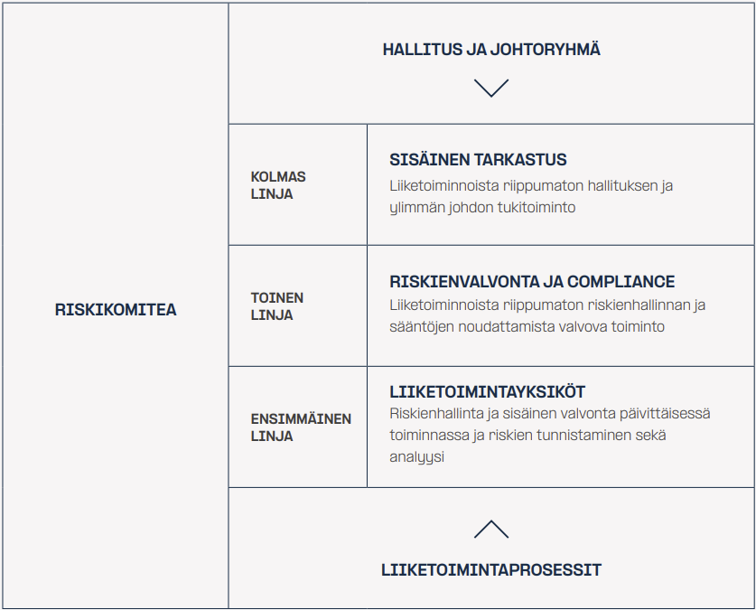 Riskienhallinta on osa sisäistä valvontaa, ja riskienhallintatoimenpiteiden toteuttamisvastuu on näin ollen ensimmäisenä linjana liiketoimintayksiköissä.