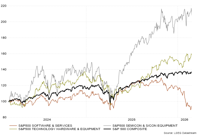 Investeringarna i artificiell intelligens har nått historiska mått: Alphabet, Meta och Amazon tänker investera över 500 miljarder dollar i AI-infrastruktur, vilket klart överskrider konsensusprognoserna. Detta håller efterfrågan på halvledare på en hög nivå och stöder branschens tillväxt. På tillväxtmarknaderna är avkastningsförväntningarna starka. Bland annat Taiwan och Sydkorea drar nytta av halvledarsektorn och industrins starka ställning. I februari steg Koreanska aktieindexet Kospi med drygt 20 procent, mätt i euro. Indexet MSCI Kina sjönk med nästan sex procent, men indexet MSCI Tillväxtmarknaderna steg ändå med drygt sex procent. Också i Japan steg kurserna kraftigt och MSCI Japan stannade på drygt plus sju procent, mätt i euro. Under ett år har japanska yenen tappat cirka 18 procent mot euron.