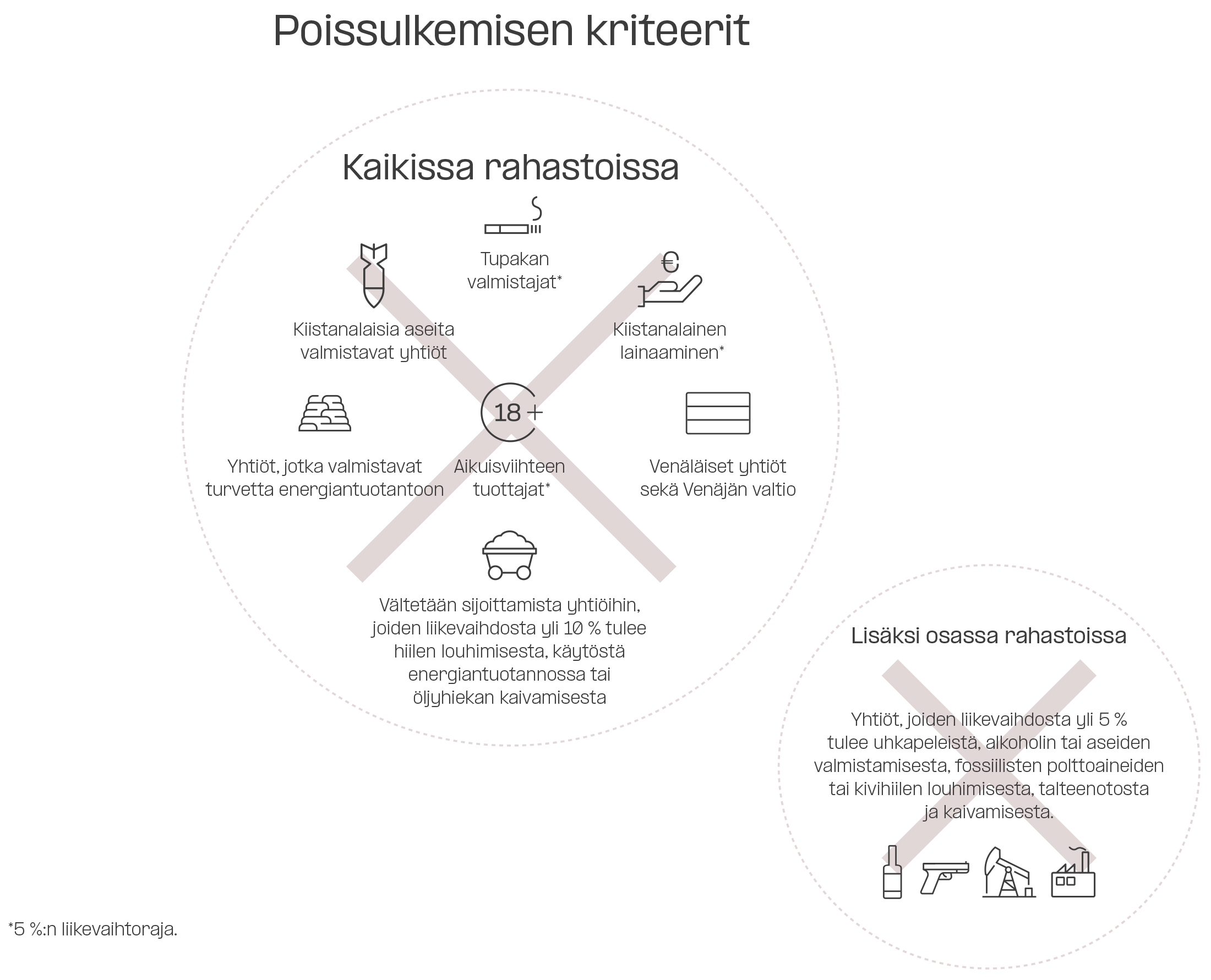 Poissulkeminen on yksi konkreettisimmista tavoista toteuttaa vastuullisen sijoittamisen periaatteita. Evlissä noudatetaan kaksivaiheista poissulkemista: kaikkia Evlin aktiivisia osake- ja korkorahastoja ja sijoituskohteita koskevat tietyt periaatteet*, minkä lisäksi osa rahastoista noudattaa laajempia poissulkemisen kriteereitä.